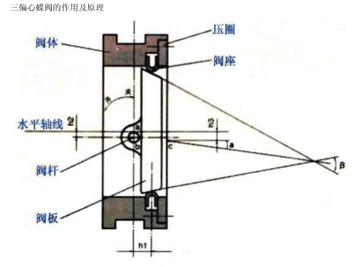 三偏心蝶閥顧名思義,就是給蝶閥了做了三次偏心,這種設計工藝使得三偏心蝶閥擁有廣泛的應用領域,它不僅具備了軟密封蝶閥那樣良好的密封性能,同時擁有硬密封蝶閥耐高溫高壓的特性。之所以擁有這些優(yōu)點,得益于三偏心蝶閥的結構,本篇文章就來聊一聊三偏心蝶閥的結構和原理。