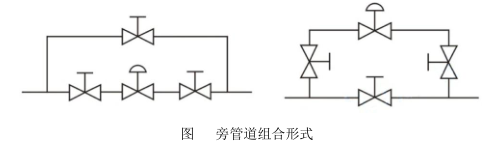 (5)為了在調節閥出現故障時不影響生產和發生安全事故,一般都需要安裝旁路管線(旁通管道組合形式見下圖)。對于高溫、高壓、易凍、易堵和粘稠介質,還應安裝排泄閥。