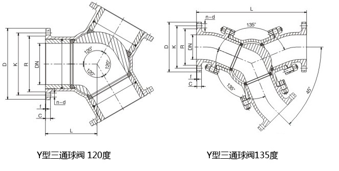 Y型三通球閥有相互成120°和兩通孔成135°,根據需要可實現對介質流向切換,能比相互垂直的兩個通道三通球閥流阻更小。