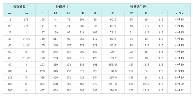 公稱通徑(mm) | 15 | 20 | 25 | 32 | 40 | 50 | 65 | 80 | 100 | 125 | 150 | 200 | 250 | |