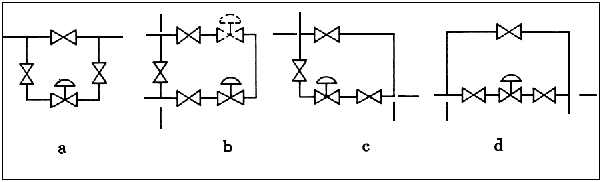 (4) 調節閥組:一般在工藝過程配管中均安裝切斷閥的旁路閥與調節閥配成閥組,以適應設備連續操作的需要。維修調節閥時用切斷閥隔離。用旁路閥調節。下面圖4中推薦四種調節閥組布置方式。